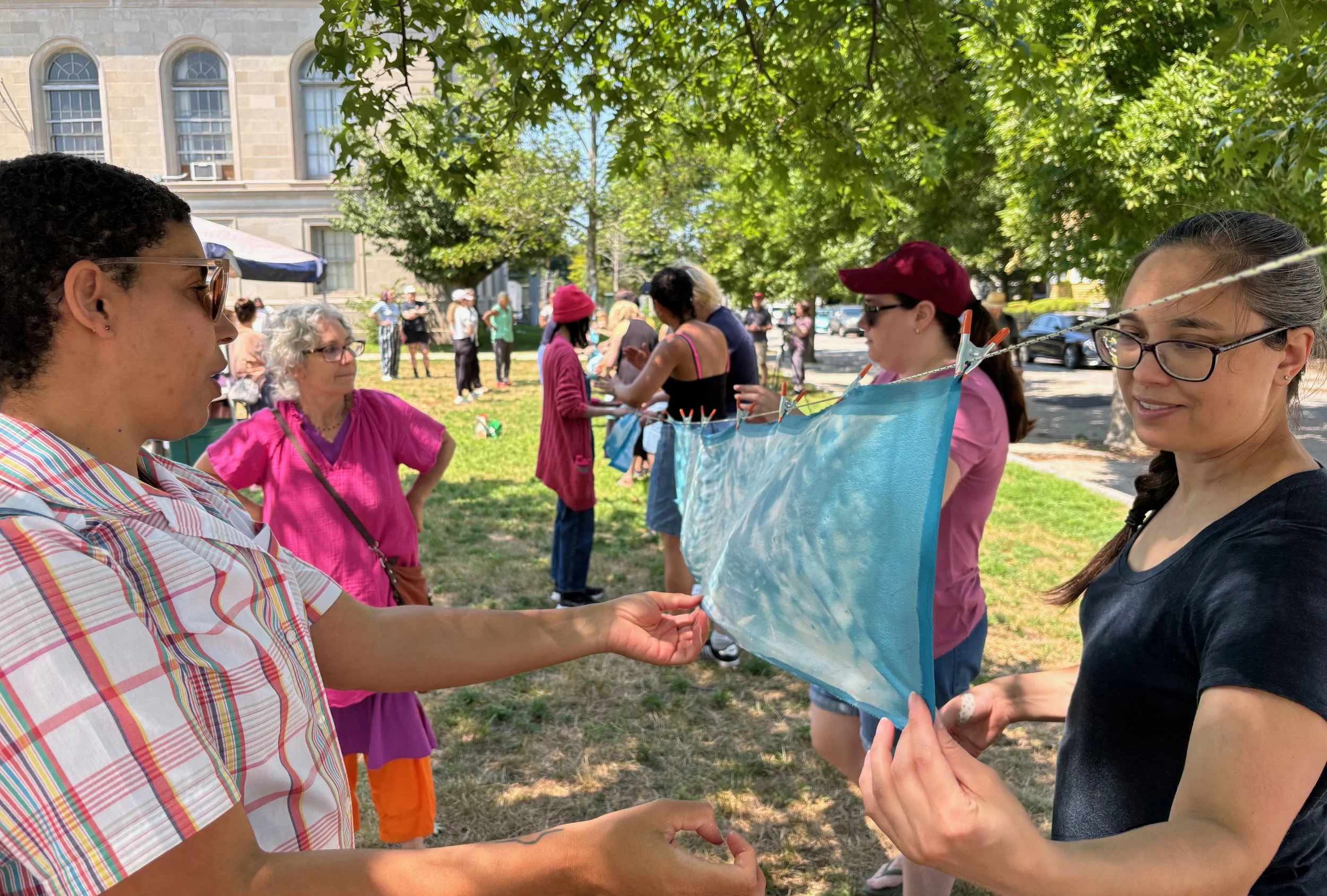 Moonscapes is a large-scale community program that engages Rhode Island youth in combining art with planetary sciences. Moonscapes was funded by grants from the NASA RI Space Grant, LunaSCOPE (a NASA-funded consortium for lunar research), and the Brown Arts Institute. Through an artist residency at the Community Libraries of Providence, Logan Tullai hosted three community cyanotype printing events at Knight Memorial Library, where attendees used the sun’s ultraviolet rays to print 7-foot-tall pictures of the Moon on silk from archival film photos. Using panoramic film photos of the Moon from the Apollo 15 mission, this community project created a 7-foot-by-20-foot mural of hanging silk scrolls. In addition to this collective piece, participants also took home their own piece of the Moon -- an original round print from the Apollo film.